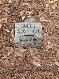 Serena took a break from chasing ducks to sniff the ground. She smelled something that should not have been there and began to push aside the dirt and leaves. Serena found a strange stone with letters on it. She got her dad’s attention. He bent down and read aloud: “Buddie 1928-1941: Born a Dog, Died a Gentleman.”